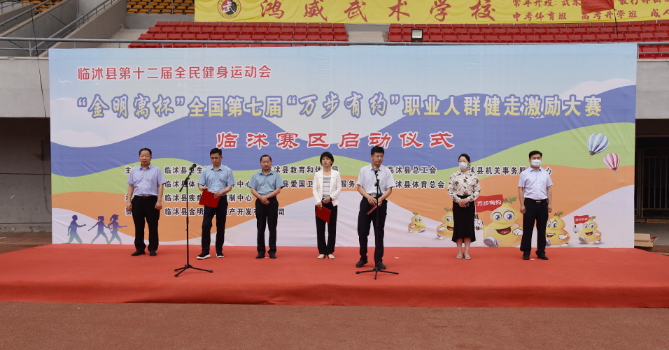 On June 9th, the 7th "Jinmingyu Cup" National "About 10,000 Steps" Professional Walking Incentive Competition was held in Linshu County Stadium. Hu Wenjun, deputy Head of the County government, Fu Chengfei, Secretary of the Party Group and Executive Vice Chairman of the County Federation of Trade Unions, Zhuang Li, member of the Party group of the County Government Office and director of the Office Affairs Service Center,  Wu Chuanguo, deputy secretary of party group and director of sports Development Service Center of county Education and Sports Bureau, Li Yu, deputy director of county Health bureau and director of CDC, Huang Xifeng, Secretary of Party committee of Shandong Weiye Group and General manager of Jinmingyu Real Estate Development Company attended the launching ceremony, which was presided over by Yin Changming, secretary of Party group and director of County health Bureau.